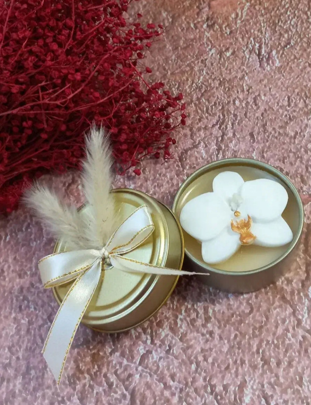 گیفت شمع قوطیmoonlight با گل ارکیده سفید طلایی