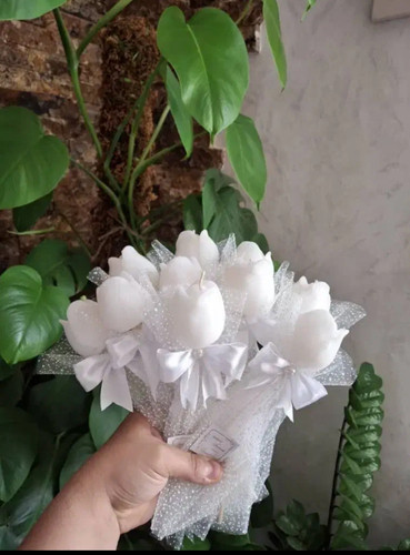 گیفت شمع دسته گل لاله moonlight رنگ سفید با تزیین تور و ربان و لیبل