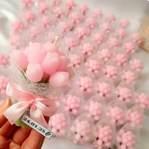 گیفت عروسی و نامزدی شمع دسته گل لاله moonlight دو رنگ با تور و ربان و لیبل اسم خودتون