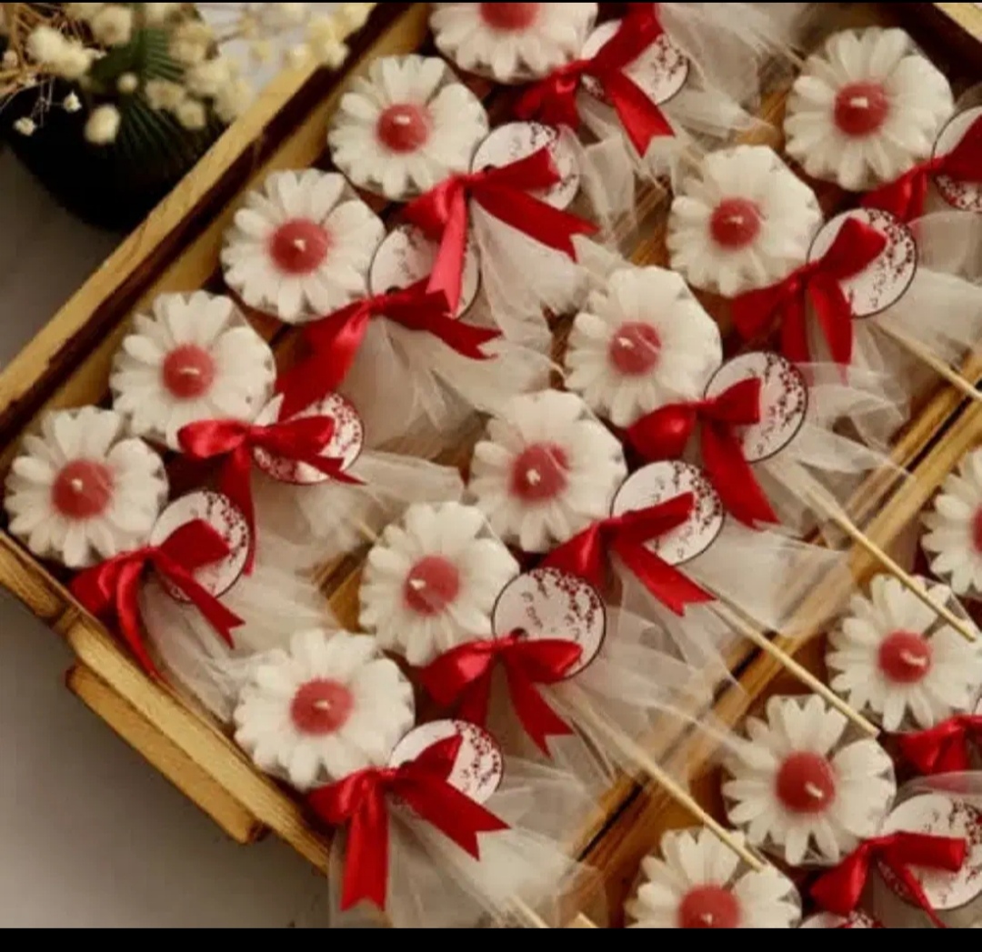 شاخه گل شمع بابونه moonlight با تزیین تور و ربان قرمز باصرفه و اقتصادی